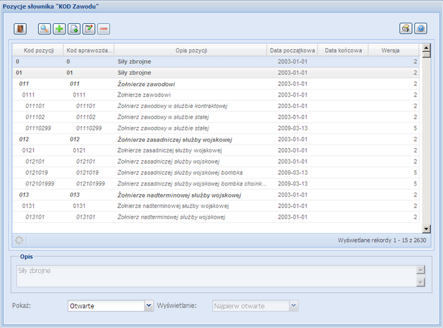 Aby odszukać na liście zawód, wpisujemy jego kod sprawozdawczy w pole Filtruj kolumny Kod sprawozdawczy lub nazwę w pole Filtruj kolumny Opis pozycji: